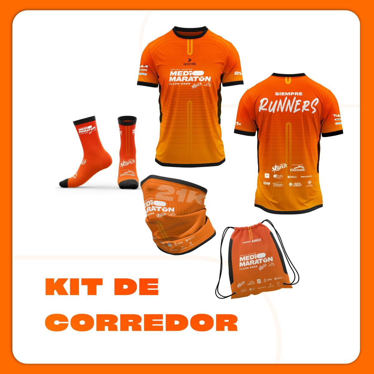 it del corredor: playera, morral, bandana, calcetas y medalla sustentable.